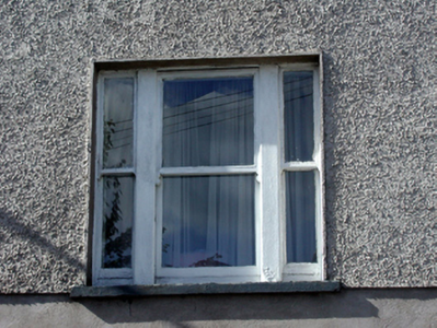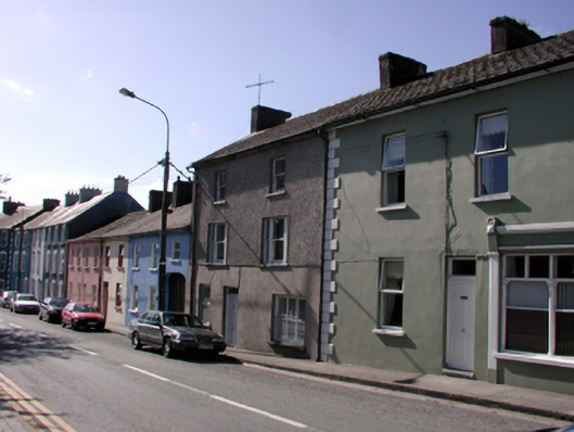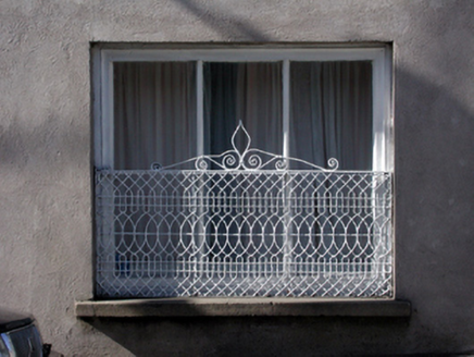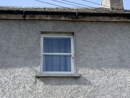 Terraced two-bay three-storey house, c.1880, retaining original fenestration. Reroofed and renovated, c.1930, with window openings remodelled to right ground floor probably to accommodate commercial use. Pitched (shared) roof with replacement artificial slate, c.1930, clay ridge tiles, rendered (shared) chimney stacks, and cast-iron rainwater goods on rendered eaves. Unpainted rendered wall to ground floor (probably replacement, c.1930). Unpainted roughcast walls to upper floors. Square-headed window openings (in tripartite arrangement to first floor; remodelled, c.1930, to right ground floor) with rendered sills. 1/1 timber sash windows with 1/1 sidelights to tripartite openings, and fixed-pane (three-light) timber window, c.1930, to remodelled opening having decorative iron guard. Square-headed door opening with timber panelled door, and overlight. Road fronted with concrete footpath to front.