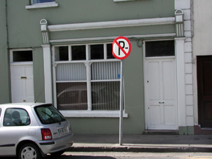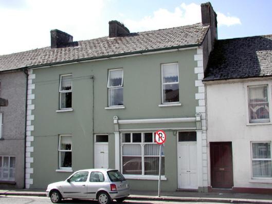 Terraced three-bay two-storey house with dormer attic, c.1850. Renovated, c.1900, with shopfront inserted to right ground floor. Reroofed, c.1950. Refenestrated, c.2000. Now entirely in residential use. Pitched (shared) roof with replacement artificial slate, c.1950, clay ridge tiles, rendered chimney stacks, square rooflights, c.2000, and cast-iron rainwater goods on rendered eaves. Painted rendered walls with rendered quoins to ends. Square-headed window openings with stone sills, and replacement uPVC casement windows, c.2000. Square-headed door opening with timber panelled door, and overlight. Rendered shopfront, c.1900, to right ground floor with chamfered pilasters, fixed-pane timber display window having colonette detailing, timber panelled door with overlight, fascia over on stringcourse having decorative consoles, and moulded cornice. Road fronted with concrete footpath to front.