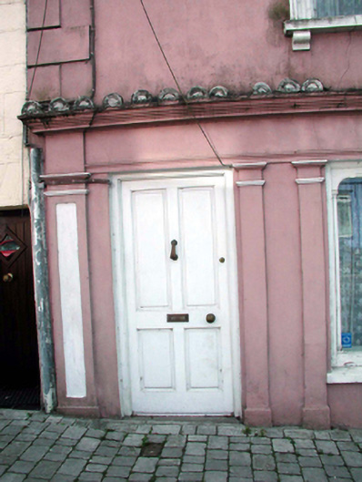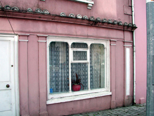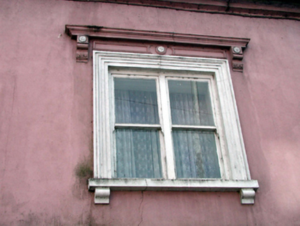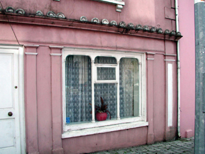 Terraced single-bay two-storey house with dormer attic, c.1870, retaining original aspect with shopfront to ground floor. Now entirely in residential use. Pitched slate roof with clay ridge tiles, rendered chimney stacks, rendered coping, and cast-iron rainwater goods on rendered eaves. Painted rendered walls with rendered quoins to first floor. Square-headed window opening in bipartite arrangement with rendered sill on consoles, moulded rendered surround having entablature over on consoles, and 1/1 timber sash windows. Rendered shopfront to ground floor with panelled pilasters, fixed-pane (three-light) timber display window having elliptical-headed panes with casement section to centre (possibly inserted, c.1970), timber panelled door, and rendered fascia over having moulded cornice with decorative cresting. Road fronted with concrete brick cobbled footpath to front.