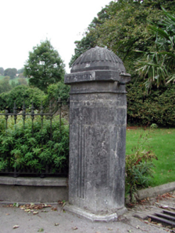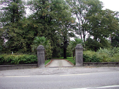 An attractive gateway forming a picturesque feature fronting directly on to the streetscape. The construction of the piers attests to high quality stone masonry, particularly in the instances of the inscribed detailing, while the survival of a section of original wrought iron railings enhances the visual appeal of the composition.