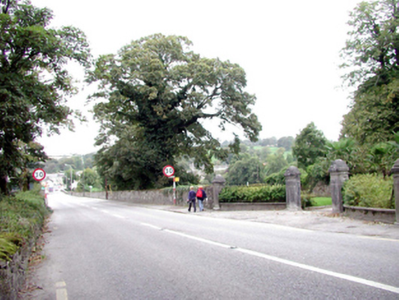 Gateway, c.1840, comprising pair of limestone ashlar piers having inscribed detailing, chamfered corners, cut-stone stringcourses with inscribed lettering, profiled capping, and section of wrought iron curved railings to north on unpainted rendered plinth extending to limestone ashlar terminating piers having inscribed detailing, chamfered corners, cut-stone stringcourses, profiled capping, and sections of random rubble stone flanking boundary walls to perimeter of site. Gates and section of wrought iron railings to south now missing. Road fronted at entrance to grounds of Derriheen House.