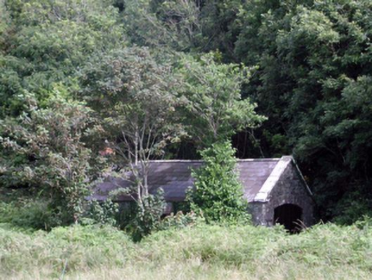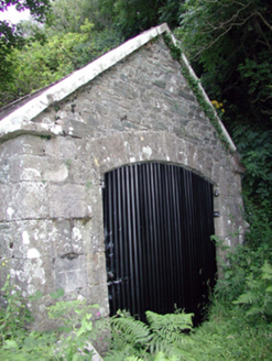 Detached single-bay single-storey gable-fronted rubble stone boathouse, c.1875, with shallow segmental-headed carriageway, and single-bay single-storey side elevations to north-east and to south-west. Pitched (gable-fronted) slate roof with clay ridge tiles, red brick Running bond chimney stack, and cut-granite coping. Random rubble stone walls with dressed granite quoins to corners. Square-headed window openings with stone sills, and red brick surrounds. Fittings not visible. Shallow segmental-headed carriageway with cut-granite voussoirs, and painted replacement corrugated-iron double doors, c.2000. Set back from road in own grounds with overgrown grounds to site.