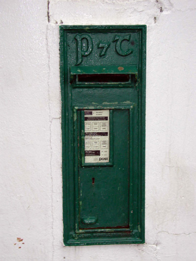 Wall-mounted cast-iron post box, c.1935, with raised 'P&T' monogram in Gaelic script. Set into painted rendered wall.
