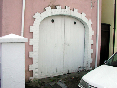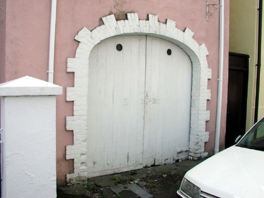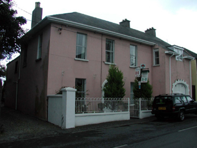 Detached four-bay two-storey house, c.1840, with single-bay single-storey lean-to projecting bay with half-dormer attic to right having elliptical-headed carriageway to ground floor. Extensively renovated and extended, c.1865, comprising single-bay two-storey flat-roofed lower return to south. Reroofed, c.1990, with half-dormer attic remodelled. Now in use as guesthouse. Hipped and pitched roof (continuing into lean-to to projecting end bay) with replacement artificial slate, c.1990, clay ridge tiles, rendered chimney stacks, replacement flat felt roof, c.1990, to half-dormer attic window, and replacement uPVC rainwater goods, c.1990, on replacement uPVC eaves, c.1990. Flat felt roof to return with plastic rainwater goods. Painted rendered walls. Square-headed window openings with rendered sills. Replacement aluminium casement windows, c.1965, having margins with replacement uPVC casement window, c.1990, to half-dormer attic. Round-headed door opening with moulded rendered surround, replacement glazed uPVC panelled door, c.1990, having sidelights, and spoked fanlight. Elliptical-headed carriageway with painted red brick block-and-start surround, and timber boarded double doors. Road fronted with sections of hoop iron railings to front on painted rendered plinth having wrought iron gate, and painted rendered terminating piers.
