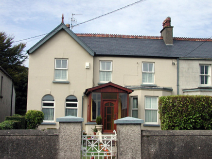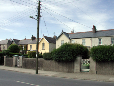 Semi-detached three-bay two-storey house, c.1870, with single-bay two-storey gabled advanced end bay to left, single-bay single-storey canted bay window to right ground, floor and single-bay two-storey return to north-west having single-bay two-storey lean-to bay to north-west. Extensively renovated, c.1995, with replacement single-bay single-storey gabled projecting glazed porch added to centre. One of a pair forming part of a group of four. Pitched (shared) slate roof on an L-shaped plan (forming gable to end bay) with decorative red clay ridge tiles, rendered chimney stacks (one shared), timber bargeboards having finial to apex, and cast-iron rainwater goods on rendered eaves. Pitched (gabled) artificial slate roof to porch with timber bargeboards, and plastic rainwater goods on timber eaves. Painted rendered, ruled and lined walls with moulded rendered cornice to canted bay window. Square-headed window openings with paired round-headed window openings to ground floor advanced end bay having cut-stone sills, and keystones to round-headed window openings. Replacement uPVC casement windows, c.1995. Square-headed openings to porch with glazed timber panelled door having overlights, and fixed-pane timber sidelights on concrete sill. Square-headed door opening to house with timber panelled door, sidelights, and overlight. Set back from road in own grounds with landscaped grounds to site having unpainted roughcast boundary wall to perimeter with unpainted roughcast piers, and decorative cast-iron gate.