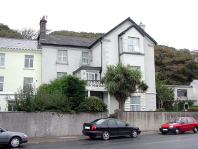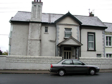 End-of-terrace three-bay two-storey over raised basement house, c.1870, on a quasi L-shaped plan comprising two-bay two-storey over raised basement main block with single-bay two-storey over raised basement gabled projecting end bay to left (south-west), and three-bay two-storey over raised basement rear (north-west) elevation with single-bay two-storey gabled entrance breakfront. Extensively renovated and extended, c.1995, with single-bay two-storey flat-roofed infill open porch added to corner, single-bay three-storey gabled box bay window added to projecting bay, single-bay three-storey gabled projecting bay added to side (north-east) elevation having single-bay three-storey gabled box bay window, and single-bay single-storey gabled projecting open porch added to breakfront to rear (north-west) elevation. Now in use as apartments. One of a pair forming part of a terrace of three. Pitched roofs (gabled to box oriel windows; gabled to porch) with replacement artificial slate, c.1995, clay ridge tiles, rendered panelled chimney stacks, timber eaves, and replacement uPVC rainwater goods, c.1995, on rendered eaves. Flat felt roof to infill porch. Painted replacement roughcast walls, c.1995, with painted cut-limestone stringcourse to basement, roughcast quoins to corners, and rendered stepped cornices. Painted rendered, ruled and lined walls to rear (north-west) elevation with painted red brick quoins to corners, and painted red brick surrounds to gable to breakfront forming ‘pediment’. Square-headed window openings (some originally in tripartite arrangement) with stone sills, and some with moulded rendered surrounds. Replacement uPVC casement windows, c.1995. Square-headed door opening to breakfront under gabled open projecting porch with glazed timber panelled door, and overlight. Set back from road in own grounds with forecourt having unpainted roughcast boundary wall to perimeter with rendered piers and hoop iron gate, and rear (north-west) elevation fronting on to road with painted replacement cement rendered boundary wall, c.1970.