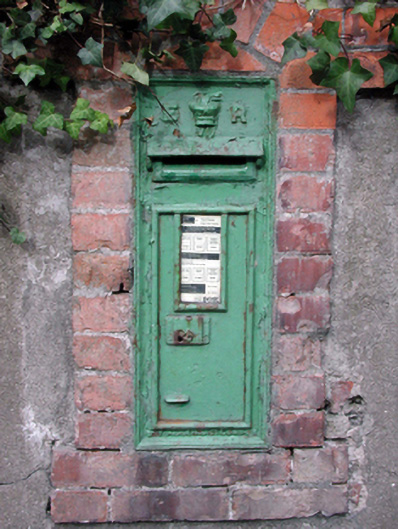 Wall-mounted cast-iron post box, c.1905, with raised “ER VII” royal cipher. Set in unpainted rendered boundary wall with red brick surround having shallow segmental capping.