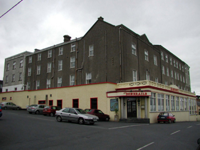 Attached three-bay three-storey hotel, built 1794, on a rectangular plan centred on single-bay three-storey pedimented breakfront. Pitched slate roof behind parapet centred on pitched (gabled) slate roof (breakfront), clay or terracotta ridge tiles, cut-granite coping to gables with rendered chimney stacks to apexes having capping supporting terracotta pots, and concealed rainwater goods with cast-iron octagonal hoppers and downpipes. Roughcast walls with cut-granite stringcourse supporting parapet having cut-granite coping; roughcast surface finish (breakfront) with cut-granite monolithic pediment. Remodelled openings (ground floor). Square-headed window openings (upper floor) with cut-granite sills, and concealed dressings framing replacement uPVC casement windows replacing six-over-six timber sash windows. Street fronted on a corner site.