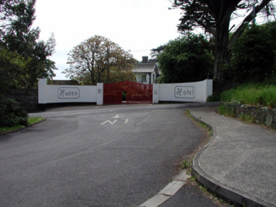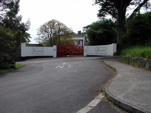 Gateway, c.1965, incorporating fabric of earlier gateway, c.1865, on site comprising painted cement rendered piers with cast-iron equine finials, and painted cement rendered curved flanking walls. Road fronted at entrance to grounds of Haven Hotel (Villa Marina).