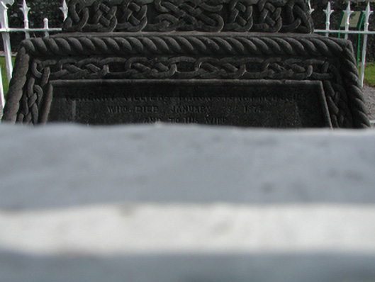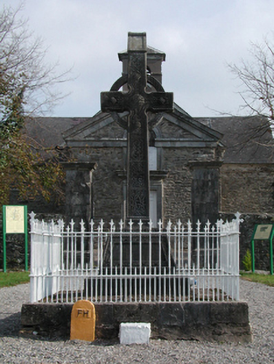 Freestanding cut-limestone Celtic High Cross-style monument, dated 1874. Street fronted with battered plinth to perimeter supporting cast-iron railings.