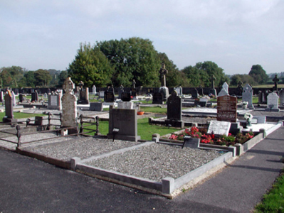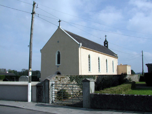 Detached four-bay double-height Catholic church, dated 1856, with single-bay double-height chancel to north-east. Extended, c.1955, comprising single-bay single-storey flat-roofed sacristy to east. Part refenestrated, pre-1999. Pitched slate roof with clay ridge tiles, rendered coping having cross finial to apex to south-west, rendered gabled bellcote to apex to north-east having cross finial over, and cast-iron rainwater goods on rendered eaves having wrought iron brackets. Flat felt roof to sacristy with cast-iron rainwater goods on timber eaves. Painted roughcast walls with cut-stone date stone/plaque. Pointed-arch window openings to nave with rendered sills, and chamfered surrounds. Replacement fixed-pane uPVC windows, pre-1999, with casement sections. Trefoil-headed window opening over entrance to south-west in pointed-arch frame with rendered sill, chamfered surround, and fixed-pane leaded stained glass window. Pointed-arch window opening to chancel with rendered sill, chamfered surround, cut-limestone mullions and tracery forming tripartite trefoil-headed arrangement with quatrefoils and hexafoil to arch, and fixed-pane leaded stained glass windows. Four-centre-headed door opening with rendered chamfered reveal, and replacement tongue-and-groove timber panelled double doors, pre-1999. Full-height interior with carved timber pews, polished marble communion railing, and decorative Gothic-style reredos. Set back from road in own grounds. (ii) Graveyard to site with various cut-stone grave markers, c.1855 – present. (iii) Gateway, 1856, to west comprising pair of painted rendered piers with rendered profiled capping, decorative cast-iron double gates with Fleur-de-Lys and cross finials, and painted roughcast boundary wall to perimeter of site having painted rendered coping.