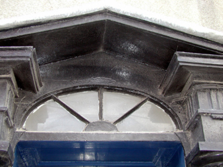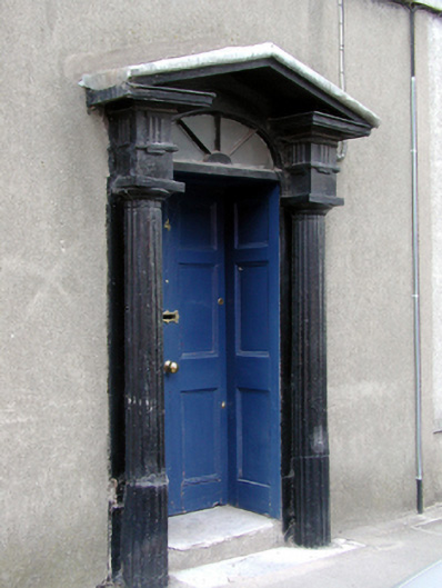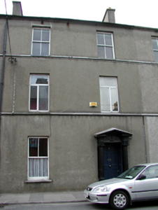 Terraced two-bay three-storey house, c.1750. Refenestrated, c.1850. Part refenestrated, pre-1999. One of a terrace of four. Pitched (shared) slate roof with clay ridge tiles, rendered (shared) chimney stacks, and cast-iron rainwater goods on rendered eaves. Unpainted rendered walls with cut-stone stringcourses to each floor. Square-headed window openings with cut-stone sills (forming sill courses to upper floors). Replacement 2/2 timber sash windows, c.1850, with replacement uPVC casement windows, pre-1999, to first floor. Round-headed door opening with fluted timber Doric doorcase having open-bed pediment over, timber panelled reveals, timber panelled door, and spoked fanlight. Interior with timber panelled shutters to window openings. Road fronted with flagged footpath to front.