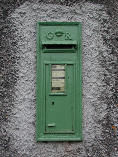 Wall-mounted cast-iron "wall box" post box, extant 1922, with "GR [Georgius Rex]" royal cipher. Set in roughcast boundary wall.