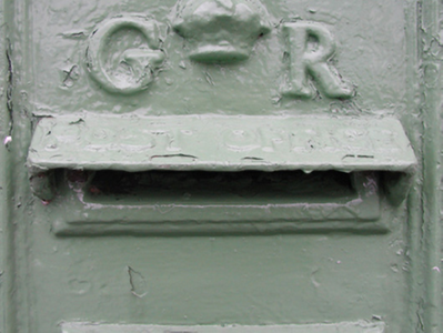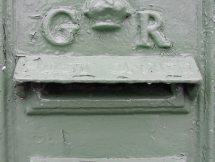 A "wall box" post box supplied by W.T. Allen and Company (fl. 1881-1955) of London representing an interesting example of mass-produced cast-iron work making a pleasing, if largely inconspicuous visual statement in a coastal village street scene with embellishments identifying the artistic potential of the composition including the King George V (1865-1936; r. 1910-22) royal cipher of additional significance as an imprinted reminder of the period when Ireland formed part of the British Empire.