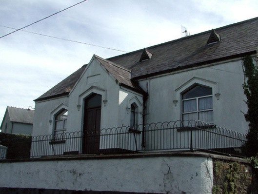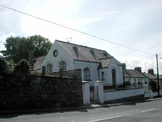 Attached three-bay single-storey Tudor-style national school, dated 1887, possibly originally detached on a T-shaped plan retaining some early fenestration with single-bay single-storey gabled projecting lower porch to centre, two-bay single-storey side elevation to north-east, and single-bay two-storey lower return to south-east. Part refenestrated, c.1965. Now disused. Pitched slate roofs on a T-shaped plan (gabled to porch) with clay ridge tiles, rendered chimney stacks, gabled lucarnes having louvered panel fittings, rendered bargeboards to porch, and cast-iron rainwater goods on rendered eaves. Painted rendered walls over random rubble stone construction with inscribed plaque to gable to porch, rendered date stone to gable to side (north-east) elevation having moulded surround, and some sections of exposed random rubble stone construction. Triangular-headed window openings with rendered sills (some without sills), and rendered hood mouldings on decorative drops. Replacement aluminium casement widows, c.1965, to front (north-west) elevation retaining early fixed-pane timber windows to remainder. Triangular-headed door opening with rendered hood moulding over on decorative drops, replacement timber panelled double doors, c.1965, and overlight. Set back from line of road on elevated base with painted rendered wall over random rubble stone construction, rendered coping, hoop iron railings over, and painted rendered piers to left with rendered capping, and hoop iron double gates.