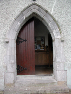 Detached four-bay double-height Catholic church, built 1827, on a cruciform plan comprising two-bay double-height nave with single-bay double-height transepts to north and to south, single-bay double-height shallow chancel to east, and two-bay single-storey sacristy to east. Renovated, c.1930. Pitched slate roofs with decorative red clay ridge tiles, roughcast chimney stack to sacristy, and cast-iron rainwater goods on rendered eaves. Painted replacement roughcast walls, c.1930, over random rubble stone construction. Pointed-arch window openings (lancet window openings to chancel) with stone sills, and rendered surrounds. Fixed-pane leaded stained glass windows with casement sections. Pointed-arch door openings with cut-limestone chamfered surrounds having hood mouldings over, and tongue-and-groove timber panelled doors with decorative wrought iron hinges. Square-headed window openings to sacristy with rendered sills, rendered surrounds, and replacement 2/2 timber sash windows, c.1930, having horizontal bias to panes. Square-headed door opening to sacristy with tongue-and-groove timber panelled door, and overlight. Full-height interior open into roof with carved timber pews, open work timber roof construction (with coffering to ceiling) on cut-stone corbels having trefoil-headed pierced detailing, Gothic-style reredos to chancel, ogee-headed arcades to transepts with moulded plasterwork surrounds on limestone ashlar polygonal piers, hood mouldings over, and timber panelled galleries to first floor to nave and transepts on cast-iron pillars. Set back from road in own grounds with random rubble stone boundary wall to perimeter of site having cut-stone coping, sections of wrought iron railings over, and rendered intermediary piers. (ii) Graveyard to site with various cut-stone grave markers, c.1830 - present.