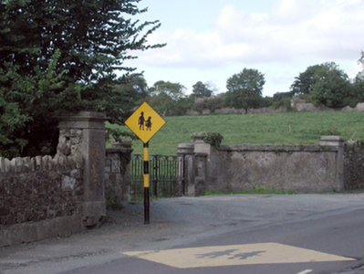 Gateway, c.1830, comprising pair of cut-stone circular piers with moulded capping, wrought iron double gates, sections of random rubble stone flanking walls having cut-stone coping, cut-stone panelled outer piers with profiled capping, and unpainted roughcast lime rendered flanking curved walls extending into unpainted rendered panelled terminating piers having sections of random rubble stone boundary wall to perimeter of site with rubble stone vertical coping. Road fronted at entrance to grounds to Clashmore House.