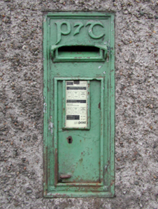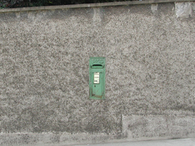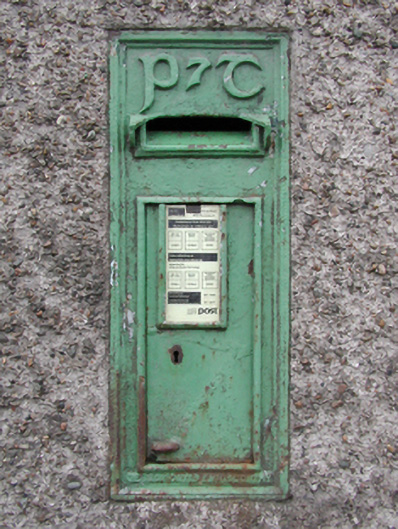 Wall-mounted cast-iron post box, c.1935, with raised 'P&T' monogram in Gaelic script. Set into unpainted roughcast boundary wall.