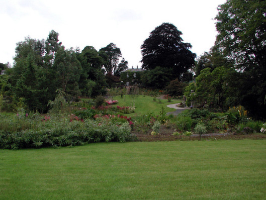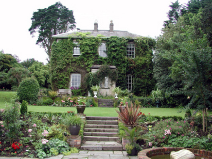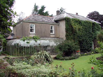 Detached three-bay two-storey house, c.1820, possibly over basement with two-bay two-storey side elevations to north-west and to south-east. Renovated and extended, c.1895, comprising two-bay two-storey lower return to south-west with three-bay single-storey wrap-around curvilinear conservatory to ground floor, and single-bay single-storey flat-roofed projecting porch added to centre. Part refenestrated, c.1995. Hipped slate roofs with rolled lead ridge tiles (red clay ridge tiles to return), rendered chimney stacks, and profiled cast-iron rainwater goods on overhanging timber eaves. Flat roof to porch not visible behind parapet. Unpainted rendered walls with rendered quoins piers to corner to original block. Unpainted rendered walls to porch with plain frieze, and moulded cornice having blocking course over to parapet. Square-headed window openings with stone sills, and 6/6 timber sash windows having replacement 2/2 timber sash windows, c.1995, to return. Paired round-headed window openings to porch with shared cut-stone sills, and 1/1 timber sash windows. Segmental-headed door opening with two cut-limestone steps, timber panelled door, sidelights, and fanlight. Wrap-around curvilinear conservatory to south-west with fixed-pane glazing in cast-iron frame. Interior with timber panelled shutters to window openings. Set back from road in own grounds with landscaped grounds to site having shallow terraces to north-east with flights of six cut-limestone steps.