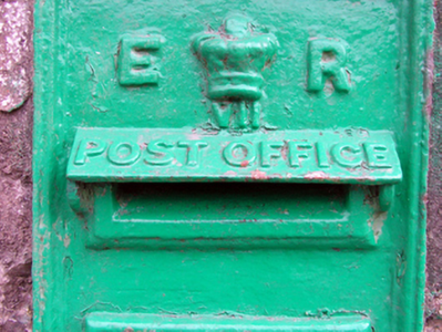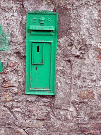 Wall-mounted cast-iron post box, c.1910, with inscribed “ER VII” royal cipher. Set in random rubble stone boundary wall.