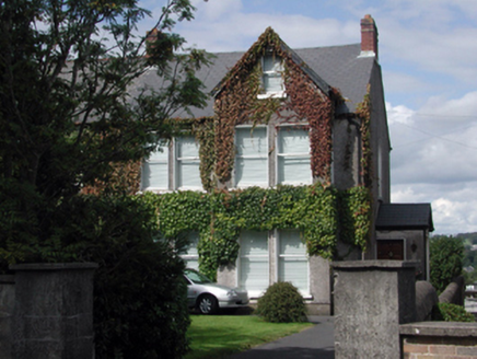 Semi-detached four-bay two-storey house with dormer attic, c.1910, with two-bay two-storey gabled advanced end bay to right, and single-bay two-storey side elevation to south-east having single-bay single-storey projecting porch. Extensively renovated, pre-1999. One of a pair. Pitched (shared) roof (gabled to end bay) with replacement artificial slate, pre-1999, clay ridge tiles, red brick Running bond chimney stacks having yellow brick dressings, replacement square rooflights, pre-1999, timber bargeboards, and cast-iron rainwater goods. Unpainted roughcast walls. Square-headed window openings (one round-headed window opening to side (south-east) elevation) with rendered sills. Replacement uPVC casement windows, pre-1999, retaining original 1/1 timber sash window to round-headed opening having margins. Square-headed door opening with replacement timber panelled door, pre-1999. Set back from road with forecourt having unpainted rendered wall with rendered piers.