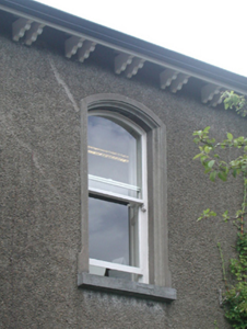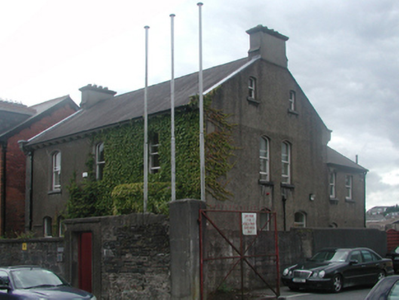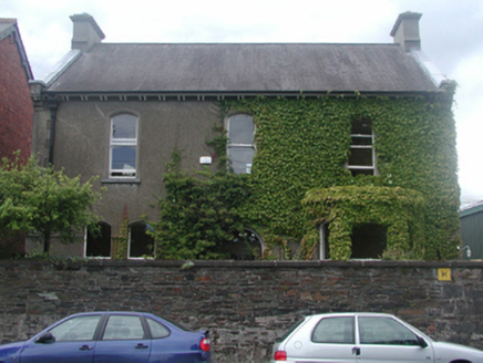 Detached three-bay two-storey house with dormer attic, c.1870, retaining original aspect with single-bay single-storey canted bay window to right ground floor, and pair of two-bay two-storey lower returns to north-east. Now in use as offices. Pitched slate roofs with clay ridge tiles, rendered chimney stacks, zinc-lined coping, and cast-iron rainwater goods on cut-stone eaves having paired consoles. Unpainted rendered walls with rendered quoins to corners. Segmental-headed window openings (paired to left ground floor) with stone sills, rendered surrounds, and 1/1 timber sash windows. Round-headed door opening with timber panelled door, and overlight. Set back from line of road with random rubble stone boundary wall to forecourt having cut-stone coping.