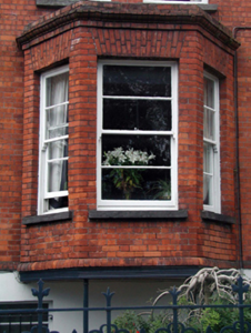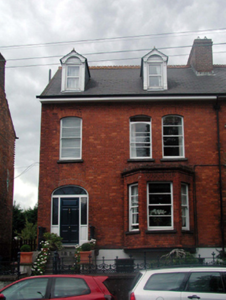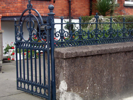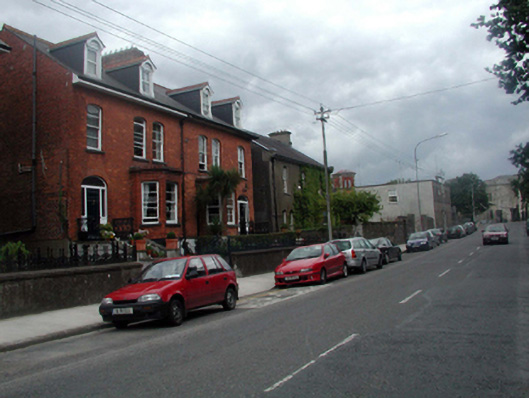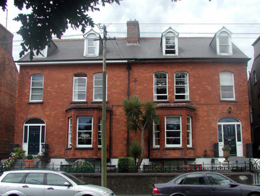 Semi-detached two-bay two-storey over part-raised basement red brick house with dormer attic, c.1890, with single-bay single-storey cantilevered canted bay window to right ground floor. Reroofed and part refenestrated, pre-1999. One of a pair. Pitched (shared) roof (gabled to dormer attic windows) with replacement artificial slate, pre-1999, decorative red clay ridge tiles, red brick English Garden Wall bond (shared) chimney stack, timber bargeboards, and replacement uPVC rainwater goods, pre-1999, on replacement overhanging timber eaves, pre-1999. Red brick Flemish bond walls with moulded red brick parapet to canted bay window. Square-headed window openings to canted bay window and to dormer attic with shallow segmental-headed window openings to first floor having stone sills. 2/2 timber sash windows having horizontal bias to glazing pattern. Replacement uPVC casement windows, pre-1999, to dormer attic. Elliptical-headed door opening approached by flight of ten tooled limestone steps having painted rendered parapets, cast-iron railings, replacement timber panelled door, pre-1999, sidelights, and overlight. Set back from line of road with unpainted rendered boundary wall to forecourt having wrought iron railings over, and wrought iron gate.