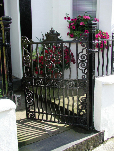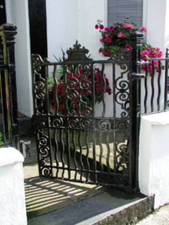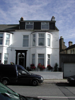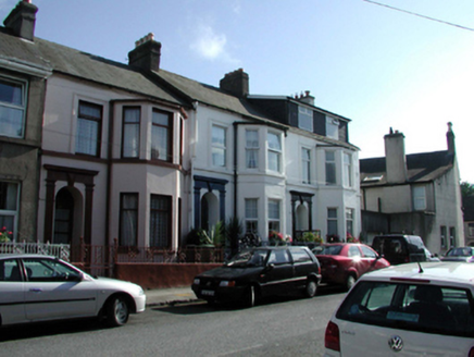 End-of-terrace two-bay two-storey house with dormer attic, c.1890, with single-bay two-storey canted bay window to right. Reroofed, c.1965, with dormer attic added. Refenestrated, c.1990. One of a group of three. Pitched (shared) roof with replacement artificial slate, c.1965, clay ridge tiles, rendered (shared) chimney stacks, rendered coping, flat felt roof, c.1965, to dormer attic window, and cast-iron rainwater goods. Painted rendered walls. Square-headed window openings with stone sills to ground floor, rendered sill course to first floor, and one with moulded rendered surround. Replacement uPVC casement windows, c.1990. Round-headed door opening with rendered pilaster doorcase having keystone, frieze, entablature over, timber panelled door, and overlight. Set back from line of road with painted rendered boundary wall to forecourt having iron railings over, cast-iron colonette piers, and iron gate.
