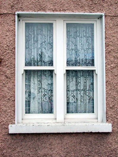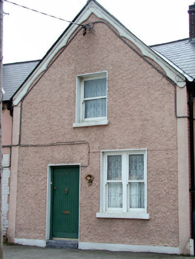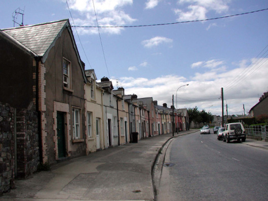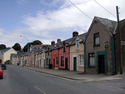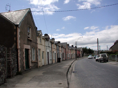 Terraced single-bay single-storey gable-fronted local authority house with half-dormer attic, dated 1898. Extensively renovated, pre-1999. One of a terrace of seventeen forming centrepiece to terrace. Pitched (shared) roofs (gable-fronted to primary pitch) with replacement artificial slate, pre-1999, clay ridge tiles, red brick Running bond (shared) chimney stacks, profiled timber bargeboards, and replacement uPVC rainwater goods, pre-1999. Painted roughcast walls with rendered strips to ends. Square-headed window openings (in bipartite arrangement to ground floor) with stone sills, and replacement 1/1 timber sash windows, pre-1999. Square-headed door opening with replacement tongue-and-groove timber panelled door, pre-1999. Road fronted with concrete footpath to front.