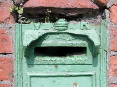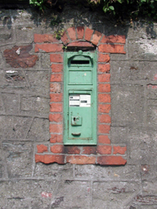 Wall-mounted cast-iron post box, c.1890, with inscribed “VR” royal cipher. Set into rubble stone boundary wall with red brick surround having shallow segmental head.