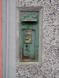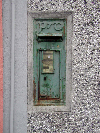 Wall-mounted cast-iron post box, c.1930, with raised 'P&T' monogram in Gaelic script. Set into pebble-dashed wall.