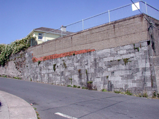 Section of broken coursed squared limestone wall, c.1865, with slight batter and red brick Flemish bond section over. Renovated, c.1990, with upper section rebuilt using mass-concrete having steel railings over. Road fronted.