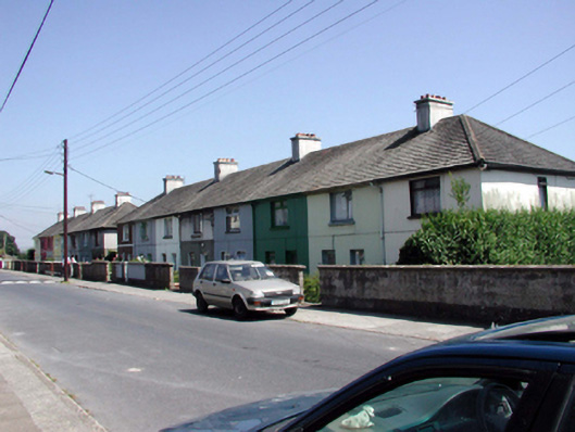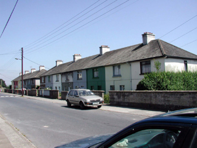 Terraced single-bay two-storey local authority house, c.1940, retaining original aspect. One of a terrace of eight forming part of a larger group of sixteen. Pitched (shared) roof with profiled clay tiles, concrete ridge tiles, rendered (shared) chimney stack, and cast-iron rainwater goods on timber eaves. Painted rendered walls with rendered band to first floor. Square-headed window openings with concrete sills, and timber casement windows. Square-headed door opening with glazed timber panelled door. Set back from line of road in own grounds with forecourt having unpainted roughcast boundary wall.