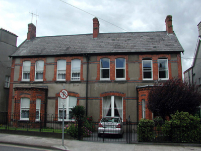 Semi-detached two-bay two-storey house, c.1880, retaining original aspect with single-bay single-storey canted bay window to right ground floor, and single-bay single-storey flat-roofed porch to side (north-east) elevation. One of a pair forming part of a group of six. Pitched (shared) slate roof with clay ridge tiles, red brick Running bond chimney stacks, and cast-iron rainwater goods on profiled red brick eaves. Flat roof to porch not visible behind parapet. Unpainted rendered walls with red brick dressings including corner piers, and stringcourses to each floor having vitrified blue brick detailing. Red brick Running bond walls to canted bay window and to porch with moulded cornice on consoles to canted bay window, and cut-stone parapet to porch. Shallow segmental-headed window openings (in bipartite arrangement to left ground floor; paired to first floor) with cut-stone sills, and red brick surrounds having vitrified blue brick dressings. 1/1 timber sash windows. Shallow segmental-headed door opening with red and vitrified blue brick dressings, timber panelled door, and overlight. Set back from line of road with forecourt having sections of iron railings to boundary on cut-limestone plinth.