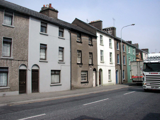 Terraced two-bay three-storey house, c.1860. Extensively renovated, c.1985. One of a pair. Pitched (shared) roof with replacement artificial slate, c.1985, clay ridge tiles, rendered (shared) chimney stack, and cast-iron rainwater goods on rendered eaves. Painted rendered, ruled and lined walls. Square-headed window openings with stone sills, and replacement timber casement windows, c.1985. Round-headed door opening with replacement timber door, c.1985, and rendered overpanel. Road fronted with concrete footpath to front.