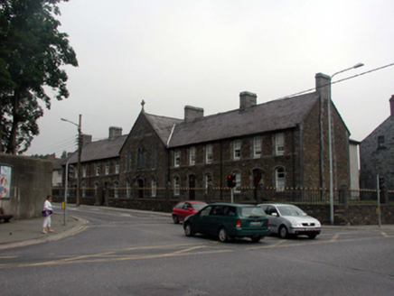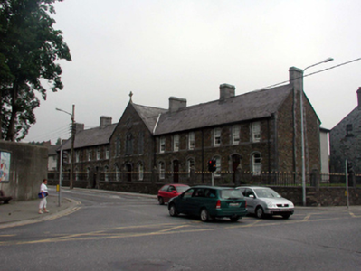 End-of-terrace three-bay two-storey rubble stone almshouse, dated 1875, on a corner site retaining most original aspect. Now in use as apartments. One of a terrace of five. Pitched (shared) slate roof with clay ridge tiles, limestone ashlar chimney stacks, cut-limestone coping and replacement uPVC rainwater goods, c.2000. Random rubble stone walls with cut-limestone quoins to corner and cut-stone courses to each floor. Pointed-arch window openings to ground floor, square-headed window openings to first floor with cut-limestone sill courses, block-and-start surrounds having chamfered reveals, and 2/2 timber sash windows with horizontal bias to glazing pattern. Pointed-arch door opening with cut-limestone block-and-start surround having chamfered reveals, replacement tongue-and-groove timber panelled door, c.2000, and overlight. Set back from line of road in shared grounds with random rubble stone boundary wall to forecourt having limestone ashlar piers with profiled polygonal capping, and sections of cast-iron railings.