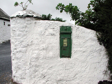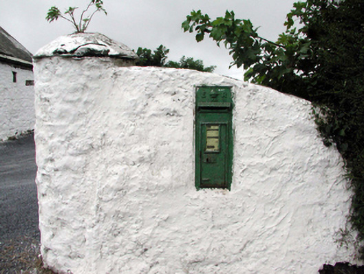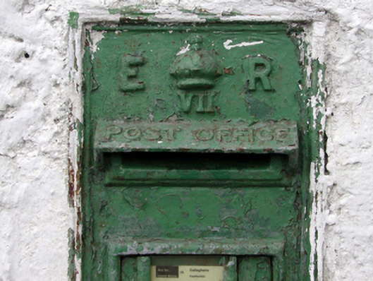 Wall-mounted cast-iron post box, c.1905, with raised “ER VII” royal cipher. Set in limewashed lime rendered rubble stone boundary wall.