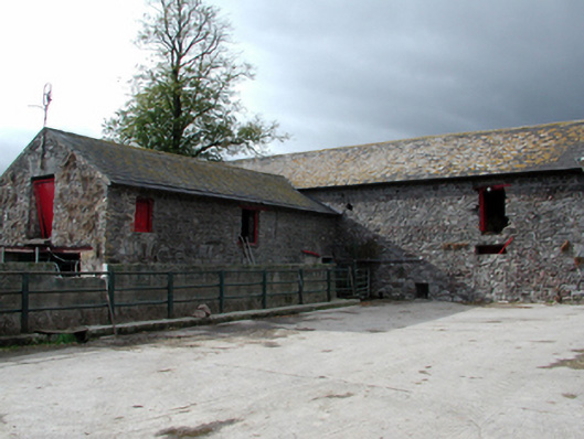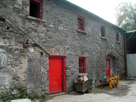Detached four-bay single-storey rubble stone outbuilding, c.1840, on an L-shaped plan with segmental-headed carriageway to right ground floor, originally with single-bay single-storey gabled projecting end bay to left ground floor, and two-bay two-storey lower return to south-east. Renovated, c.1965, with carriageway remodelled, and projecting end bay removed. Pitched slate roofs with clay ridge tiles, and cast-iron rainwater goods on slightly overhanging eaves. Random rubble stone walls with lime mortar. Square-headed window openings with cut-stone sills, red brick ‘voussoirs’, and louvered timber panel fittings. Square-headed door openings (including to first floor to return) with red brick ‘voussoirs’ to main block, squared rubble stone voussoirs to return, and replacement iron-sheeted doors, c.1965. Segmental-headed carriageway remodelled, c.1965, to accommodate square-headed door opening with red brick ‘voussoirs’, and replacement glazed timber panelled door, c.1965. Set back from road in grounds originally shared with Mount Rivers (House) with house demolished, c.1990.