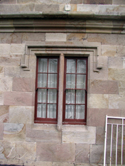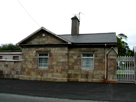 Detached single-bay single-storey gable-fronted gate lodge, c.1845, on a shallow T-shaped plan retaining some original fenestration with single-bay single-storey advanced porch to centre, single-bay singe-storey side elevations, and single-bay single-storey return to west. Extended, c.1945, comprising two-bay single-storey flat-roofed return to west. Part refenestrated, c.1970. Reroofed, c.1995. Pitched roofs on a shallow T-shaped plan with replacement artificial slate, c.1995, clay ridge tiles, rendered chimney stack, and replacement uPVC rainwater goods, c.1995, on overhanging eaves retaining original cast-iron downpipes. Flat felt roof to additional return with plastic rainwater goods on timber eaves. Sandstone ashlar walls to original block with cut-sandstone dressings including gabled piers, and surrounds to gables forming pediments. Painted rendered walls to additional return. Square-headed window openings to original block originally in bipartite arrangement (one remaining in bipartite arrangement) with cut-sandstone chamfered sills, surrounds (mullion to bipartite opening), and hood mouldings over. Replacement aluminium casement windows, c.1970, retaining original 4/4 timber sash windows to bipartite opening. Pointed segmental-headed door opening to advanced porch remodelled, c.1945, with replacement fixed-pane timber window. Square-headed window openings to additional return with concrete sills, and timber casement windows. Square-headed door opening to additional return with glazed timber panelled door. Set in shared grounds at entrance to grounds of Bon Sauveur Convent with side (south) elevation fronting on to road.