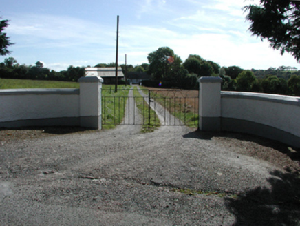 Detached four-bay single-storey thatched farmhouse, extant 1841, on a rectangular plan with single-bay single-storey flat-roofed projecting porch. Hipped water reed thatch roof with exposed lattice stretchers to raised ridge having exposed scallops, cement rendered chimney stack having corbelled stepped capping, and blind stretchers to eaves having blind scallops. Rendered battered walls. Square-headed window openings with concrete sills, and concealed dressings framing two-over-two timber sash windows having exposed sash boxes. Set in own grounds with roughcast piers to perimeter having precast concrete chamfered capping supporting wrought iron-detailed double gates.
