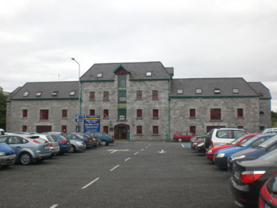 Detached former mill, built c.1840, now in use as office building. Comprises five-bay three-storey middle block with dormer floor, flanked by three-bay two-storey wings with single-bay three-storey projections to north and south elevations. Hipped and half-hipped slate roofs having pitched slate roofs to dormer-level loading doors to front and rear elevations of middle block, and cast-iron (replacement) rainwater goods. Recent skylights to roofs. Rubble limestone walls built to courses, with tooled limestone quoins, and rendered to rear. Square-headed window openings to front elevation having tooled limestone surrounds to ground floor windows, dressed limestone voussoirs elsewhere, with tooled limestone sills and six-over-six pane timber sliding sash windows. Multi-pane timber casement windows to middle first floor bays of wings having multi-pane glazing to former loading doors of central bay of middle block. Camber-headed openings to side elevations having tooled limestone sills and block-and-start red brick surrounds with soldier arches and recent replacement timber casement windows. Segmental-arched entrance to middle bay of middle block having tooled limestone block-and-start surround and voussoirs with replacement timber door. Flat-arched entrances to middle bay of wings with replacement timber vehicular doors and tooled limestone block-and-start surrounds and voussoirs. Square-headed door openings to projections having tooled limestone block-and-start-surrounds and rubbed voussoirs. Building backs onto canal.