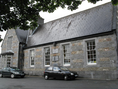 Detached five-bay single-storey limestone-built Gothic-style former orphanage, built c.1870, having slightly higher advanced two-storey south-west end bay with gables front and back with canted-bay window to front. Porch projection to south-west gable, and three-bay lean-to projection to rear. National school since 1932. later two-storey L-plan block to rear. Slate and artificial slate roofs having stepped tooled stone chimneystack with chamfered stone string course and cornice, stone eaves course and replacement uPVC rainwater goods. Tooled verges to gables with splayed ashlar skew-corbels. Coursed rough-faced walls with tooled quoins and chamfered plinth. Triangular-headed windows to porch and to front and back of gable-fronted bay except for bay window to latter. Square-headed windows elsewhere. Tooled chamfered stone block-and-start surrounds, and tooled stone sills and lintels throughout. Bay window has chamfered stone mullions and sill, square-headed lights with ornate geometric lead-lined stained glass, and hipped slate roof. Double window to gable of porch with similar geometric glazing. Relieving arches to gables Timber sliding sash windows elsewhere, six-over-six pane to rear, three-over-six pane to lean-to and six-over-nine pane to remainder of front elevation and to north-east gable, latter having tripartite window. Partly opening fixed lights to first floor of gable-fronted bay. Quatrefoil window opening to south-west gable with fixed timber stained glass. Shouldered door opening to porch and lean-to and triangular-headed to north-east, with tooled stone block-and-start surround, stone step and concrete threshold to former and replacement timber doors. Site has several rubble stone outbuildings. Boundary comprises rubble stone plinth walls with cast-iron railings and gates, vehicular entrance having tooled stone piers with cornices, caps and plinths and supporting double-leaf cast-iron gates.