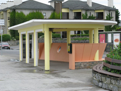 Freestanding single-storey shelter, built c.1950, having flat concrete roof and concealed cast-iron rainwater goods. Roof supported by nine prefabricated octagonal rendered concrete columns. Sloped curving concrete wall to rear (north) elevation perforated by columns and having two circular 'porthole' openings and standing on irregular coursed granite plinth with painted tile coping.