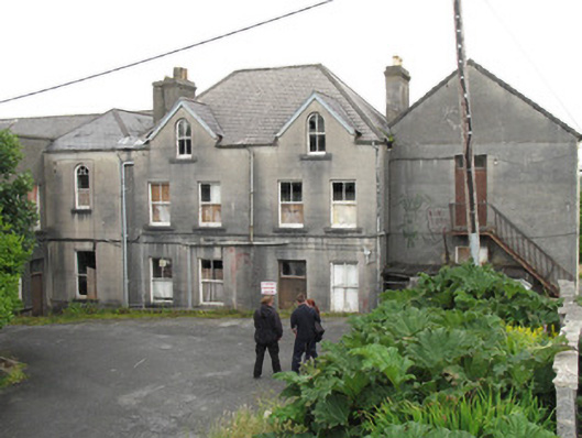 Detached twelve-bay two-storey over basement, irregular-plan former industrial school, built 1858, having projecting gable-fronted bays to front elevation. Projecting gable-fronted single-bay two-storey addition to east end with four-bay side elevation, additional blocks to rear comprising lower two-bay two-storey block to east end, pitched-roof block towards centre having three-bay two-storey lean-to addition to its west, hip-roofed single-bay two-storey and four-bay two-storey with dormer floor blocks further to west. Now vacant. Pitched slate roofs to gable-fronted bays with stone cross finials and concrete coping, hipped slate roof to central block, pitched tiled roof to west block, slate to pitched and lean-to roofs to rear blocks and artificial slate to hip-roofed blocks. Cast-iron, replacement uPVC and aluminium rainwater goods and painted rendered chimneystacks. Lined-and-ruled rendered walls, painted to south and west having render quoins, plinth and string course. Square-headed openings having tooled limestone sills throughout with exception of lean-to block. Timber sliding sash windows, one-over-one pane to front and west elevations, six-over-six pane to pitched and lean-to blocks, two-over-two pane to hip-roofed blocks. Round-headed openings to middle gable-fronted bays of front elevation and to top floor of hip-roofed blocks, having tooled limestone sills, with two-over-two pane timber sliding sash windows to dormers, spoked fanlight to single-bay block and four-over-four pane timber sliding sash window to one front projecting gable with spoked fanlight having stained-glass margins and central panel, and replacement timber window to a second projection. Square-headed openings to eastern projection and to west addition, having tripartite one-over-one pane timber sliding sash windows, having overlight to first floor of eastern projection. Replacement timber windows to western addition. Square-headed openings to entrances in middle projetions, having replacement battened and panelled timber doors with concrete and limestone stepped approaches. Five-bay two-storey former house to east, having hipped slate roof and rendered chimneystack, lined-and-ruled rendered walls, round-headed openings having concrete sills and timber awning windows, square-headed openings to rear elevations having timber sliding sash windows, and square-headed door openings.