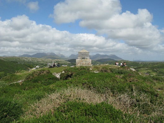 Square-plan stepped monument, erected c.1842, having rubble stone, dressed granite plinth, limestone upper section comprising cut limestone plinth and ashlar limestone blockwork and pyramidal concrete cap. Recent carved limestone plaque to west elevation commemorating John D'Arcy (1785-1839), founder of Clifden. Various examples of graffiti dating from 1871 etched into limestone section. Located on peak of hill overlooking western end of town.