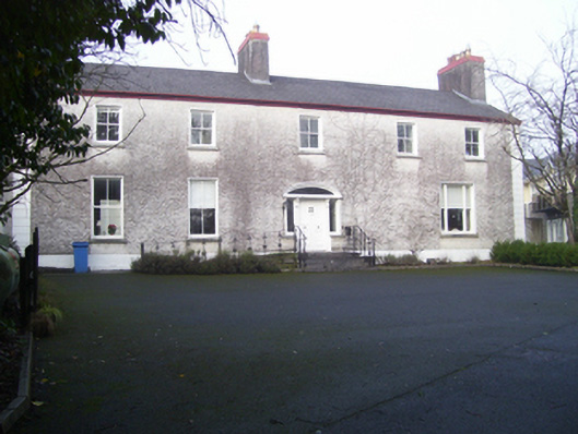 Detached two-storey house, built c.1650 and remodelled c.1810, having five-bay first floor and four-bay ground floor, and lean-to full-height one-bay addition to rear. Pitched slate roof with three substantial chimneystacks. Roughcast rendered walls with raised cemented skirting to base. Square-headed window openings, having mainly two-over-two pane timber sliding sash windows, and with one tripartite one-over-one pane window to front, with cut limestone sills. Wide segmental-headed doorcase of c.1850 comprising square-headed doorway with sidelights having rendered stall risers and cut limestone sills, and lintel supported by scroll brackets. Timber panelled double-leaf door approached by flight of limestone steps having decorative wrought-iron railings. Entrance gateway of ashlar limestone, erected c.1810, comprising square-plan piers with pairs of paterae set in moulded panels, with fluted friezes, moulded cornices and plinths, and capstones, supporting decorative cast-iron double-leaf vehicular gates of c.1850 and flanked by pointed arch pedestrian entrances having imposts and plinths and raised keystones bearing unicorns trippant, with wrought-iron gates. Quadrant walls leading to outer piers.