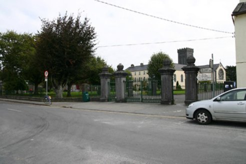 Entrance gates and boundary railings to Saint Joseph's Monastery, erected c.1830. Complex of monastery and older church and graveyard approached through gateway at south-west having decorative double-leaf vehicular gate and similar flanking pedestrian gates, with tooled limestone ashlar square-plan piers with chamfered corners, moulded plinths and cornices and globe finials with decorative banding. Gateway flanked by cast-iron railings on tooled limestone plinth walls. Inner boundary to monastery proper comprises double-leaf vehicular and one pedestrian entrance having ashlar limestone piers with plinths, moulded string courses and cornices with caps having lanterns, spear-headed cast-iron gates, flanked by cast-iron railings on cut-stone plinths, with rendered piers at intervals. Cast-iron pedestrian gate to east of chapel entrance having cast-iron railing to inner side, circular-plan tooled limestone piers with moulded plinths, moulded string courses, foliate carvings to friezes, and domed render caps. Double-leaf vehicular gateway to south having wrought-iron gate to round-plan tooled limestone piers with moulded string courses and plinths and globe finials, flanked by similar railings on cut-stone plinths. Coursed rubble limestone boundary walls to east bounding graveyard, having stepped copings terminating in square-plan dressed limestone piers with pointed caps and having ornate cast-iron double-leaf pedestrian gate. Ruined medieval abbey, and graveyard to site.