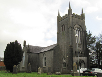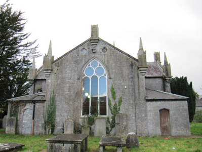 Freestanding Gothic Revival cruciform-plan former Church of Ireland church, dated 1825, having single-bay nave and transepts, with three-stage tower to front, and slightly recessed lower vestry and porch to re-entrant corners of nave and chancel. Now in use as public library. Pitched slate roofs with carved corbelled pinnacles to gables of chancel and transepts, carved limestone crenellations and corner pinnacles to tower, and hipped slate roofs to vestry and porch. Coursed squared snecked rubble limestone walls, with ashlar walls and stepped buttresses to tower corners, stepped plinth course to south elevation of tower. Double-light round-headed window opening to sides of top stage of tower, with tooled surround, hood-moulding, and timber louvres. Bottom stage of tower has lancet window to south side and stunted lancet to north, with dressed surrounds, tooled hood-mouldings and leaded multiple-pane windows. Triple-light round headed window to front of middle stage of tower, with two oculi to spandrels, hood-moulding above, and latticed stained glass, with dressed surround set in shallow round-headed recess with hood-moulding, crenellation detail to base, and tooled rectangular date plaque with inscription to apron. Pointed arch window openings to nave with dressed surrounds, tooled hood-mouldings and timber windows. Tudor arch door opening to front of tower, with stepped scalloped carved surround, tooled hood-moulding, and double-leaf timber battened door. Tudor arch former doorway to north side of tower, now infilled to window opening, having tooled surround and timber window. Bench mark to threshold. Smooth rendered walls and ceiling to interior with some white marble commemorative plaques and slabs, and brass plaques to walls. Recent gallery.
