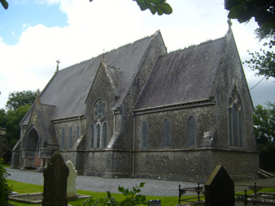 Freestanding Church of Ireland church, dated 1867, comprising four-bay nave with single-bay chancel, square-plan unfinished two-stage tower to west end of north elevation, single-bay vestry to north elevation of chancel, gable-fronted open porch to south elevation and gabled false transepts to north and south elevations. Pitched slate roof to nave and chancel having cast-iron rainwater goods and some ridge cresting, cut limestone copings and cross finials and cut limestone eaves course. Flat roof to vestry and to tower. Gabled rendered bellcote to tower. Cast-iron finial to south transept. Dressed limestone walls with cut limestone quoins, and moulded plinth course and sill course. Dressed limestone buttresses to corners and flanking false transepts, having cut limestone quoins. Cut limestone plaque to east elevation of tower, cut limestone roundel to entrance porch. Square-headed opening to second stage of west elevation of tower with timber louvers. Cut chamfered limestone surrounds to all window openings. Pointed-arch opening to chancel, having triple lancet stained-glass window with sexfoil oculi overhead and with limestone moulding to point of arch. Eyre coat of arms over exterior of window. Sexfoil oculi and triple lancet openings to each false transept, with leaded stained-glass windows. Pointed-arch opening to west end, having triple lancet stained-glass window with cinquefoil oculi overhead, and elliptical opening above. Lancet openings to nave and chancel, some having stained glass. Paired lancet openings to north elevation of vestry. Pointed-arch opening to porch with carved limestone surround and hood-moulding, and paired marble colonettes with cut limestone plinth having decorative carved Portland stone capitals and cut limestone dosserets forming jambs of entrance arch. Pointed-arch recessed arch opening to inner side of porch with double-leaf timber battened doors having decorative cast-iron hinge details, flanked by tiled panels to wall with fleur-de-lys motifs. Limestone bench under each panel. Tiled floor to entrance. Pair of shouldered-arch openings having timber battened doors to west elevation of tower, set within pointed-arch cut limestone surround with cut limestone roundel to tympanum. Limestone hood-moulding over pointed arch. Limestone step to entrance. Shouldered-arch opening to east elevation of vestry, having timber battened door with chamfered cut limestone surround, and limestone steps. Openings to vestry underground, accessed via flight of limestone steps. Highly ornate interior has pointed ceiling with timber boarding supported on pointed-arch timbers in turn supported on elaborately carved stone corbels. Walls are of red brick with bands of yellow and black brick. Windows have outer arch of black brick voussoirs. Taller windows flanked by carved stone colonettes. Polychrome tiled floor. Carved stone font and wide variety of stone, marble and brass plaques to nave. Choir area has organ, carved timber choir stalls, carved marble pulpit with steps, latter having decorative cast-iron railing. Metal chandeliers to nave and choir. Carved marble lectern to nave. Battened timber doors to nave, leading to vestry and to tower stairway. Stairway to tower has decorative wrought-iron railing to cantilevered stone steps. Church set within graveyard with lawns to front of site. Wrought-iron double-leaf gate flanked by decorative cast-iron square-plan piers, wrought-iron railings on cut limestone plinths to site boundary. Decorative timber gate to east leading to lands of Eyrecourt Castle.