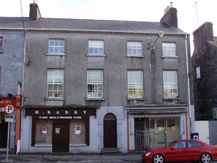 End-of-terrace four-bay three-storey house, built c.1820, with shopfronts to ground floor. Pitched slate roof with rendered chimneystacks and moulded limestone eaves course. Rendered walls. Square-headed window openings having replacement uPVC windows, and painted stone sills. Round-headed door opening with painted stone Gibbsian surround, limestone steps and timber panelled door with spoked fanlight. Shopfront to south comprising square-headed metal-framed display window, and recessed door opening with glazed timber door having overlight. Timber shopfront to north comprises timber fascia with raised lettering and carved cornice, over carved pilasters flanking timber nameplate and square-headed opening timber battened double-leaf door with paned overlight, flanked by boarded-up display windows with render sills and stall risers.